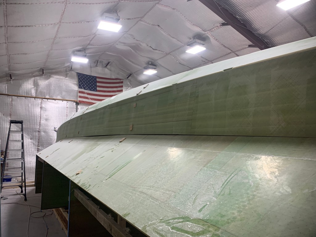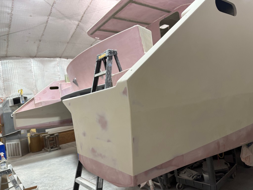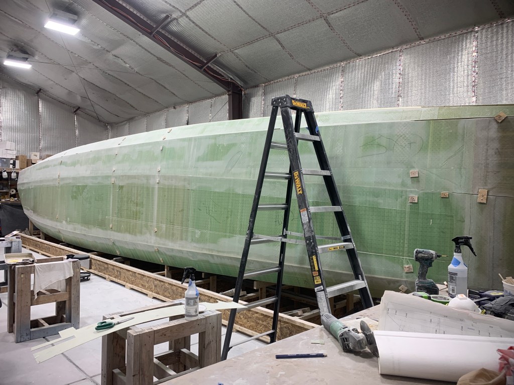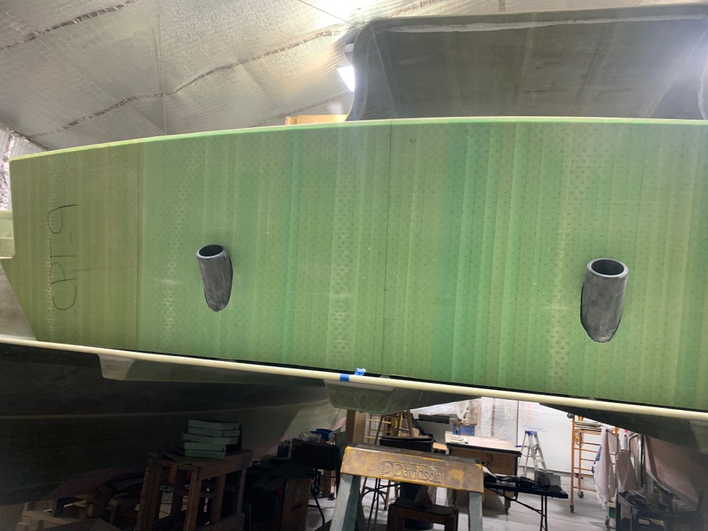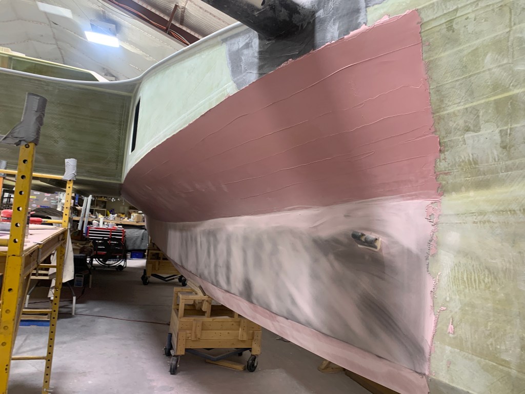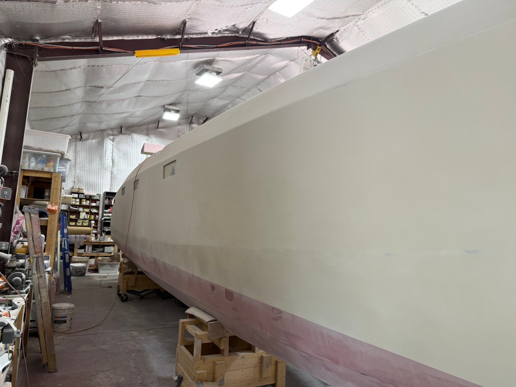 We post cure the Yacht to ensure the peak performance for our resin. Post-curing enhances physical strength and thermal properties beyond what’s achievable with room-temperature cures alone. Our post cure was a slow increase in heat over 24 hour to 104F/40C. Then we ramped up to 10 140F/60C for 10 hours. By performing this we ensure the boat will never see blead through even with dark color paint.