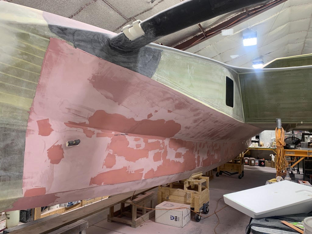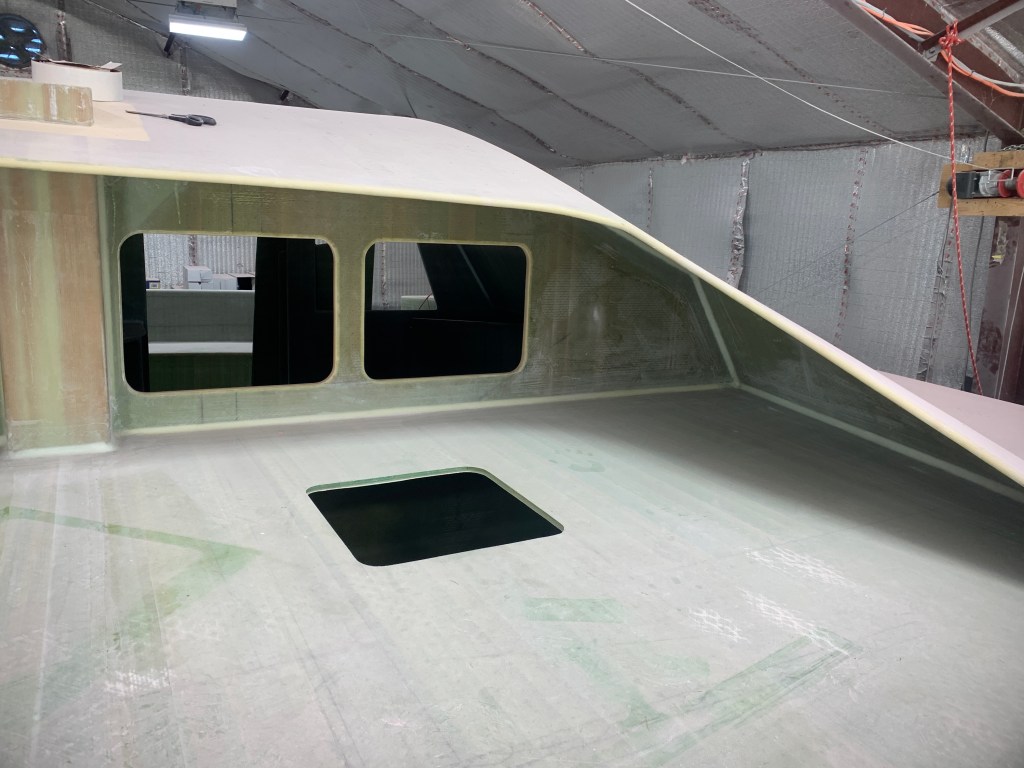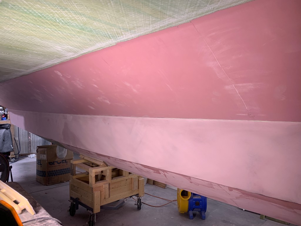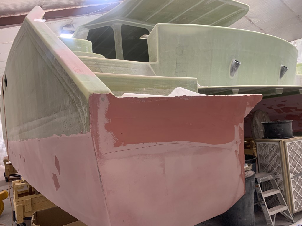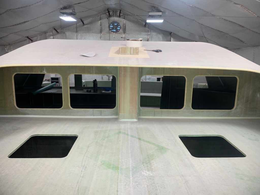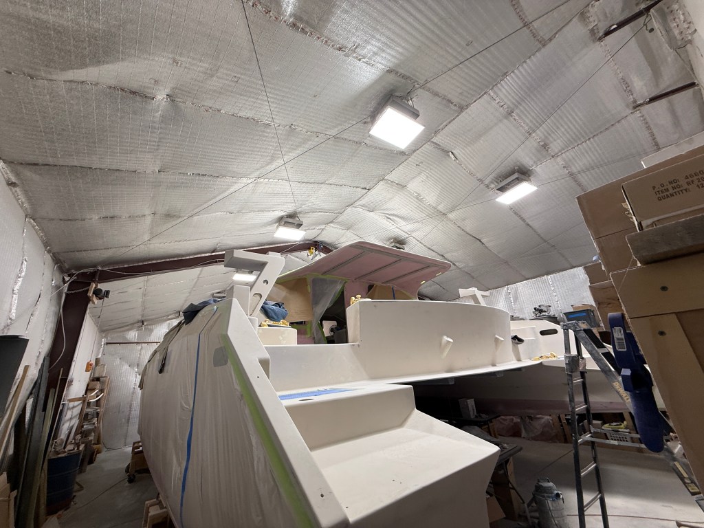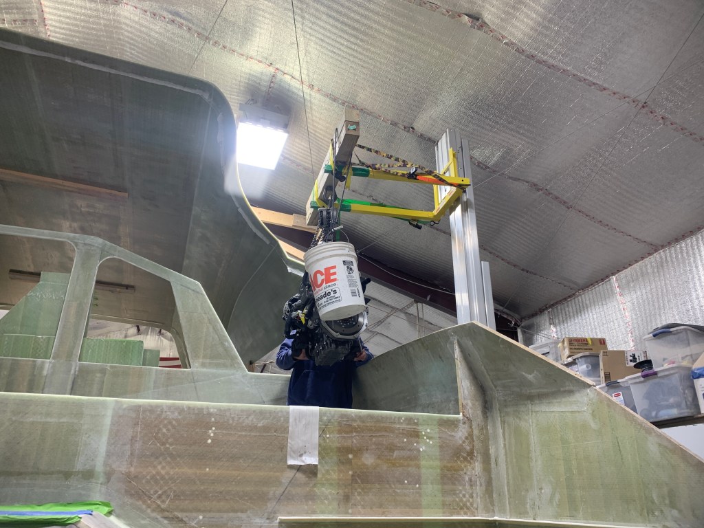 We post cure the Yacht to ensure the peak performance for our resin. Post-curing enhances physical strength and thermal properties beyond what’s achievable with room-temperature cures alone. Our post cure was a slow increase in heat over 24 hour to 104F/40C. Then we ramped up to 10 140F/60C for 10 hours. By performing this we ensure the boat will never see blead through even with dark color paint.